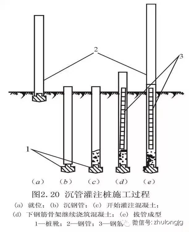 沉管灌注桩是利用锤击打桩设备或振动沉桩设备,将带有钢筋混凝土的桩尖(或钢板靴)或带有活瓣式桩靴的钢管沉入土中(钢管直径应与桩的设计尺寸一致),造成桩孔,然后放入钢筋骨架并浇筑混凝土,随之拔出套管,利用拔管时的振动将混凝土捣实,便形成所需要的灌注桩。