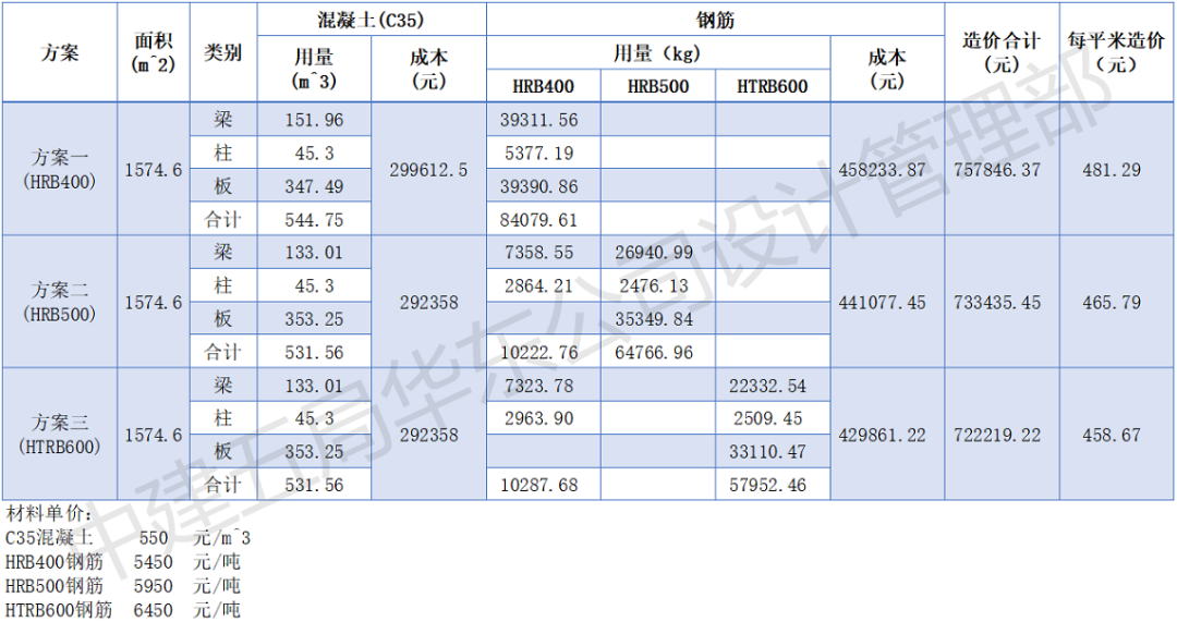 我们模拟设计了一个典型的单建地下室工程,并对其作材料和造价的对比测算(不考虑地下室底板和基础)。该地下室柱网为8.1米*5.4米,共6*6跨,总面积约1575平米,层高3.7米,顶板覆土1.5米,大板结构(只设主梁,不设次梁),顶板厚250毫米,柱截面为500毫米*500毫米,梁截面根据实际配筋率调整。地下室结构均采用C35标号混凝土,梁、柱箍筋均为三级钢,梁、板、柱的主筋分别用HRB400、HRB500和HTRB600进行设计,对这三种设计方案分别测算其混凝土、钢筋用量和整体造价。