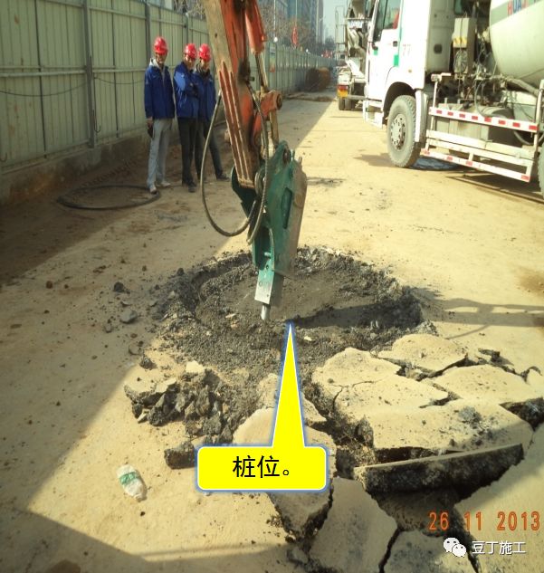 经经测量放线确定桩位后,采用破碎锤将原路面破除。