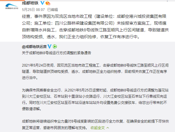 15时10分,地铁1号线0509次(178车)列车运行至深大-桃源下行区间百米标210-212处时,列车司机发现前方隧道顶部被击穿,疑似有钻头侵入,立即将情况上报。地铁运营单位随即安排后续3309次(139车)列车司机限速查看,司机确认隧道被击穿并采取紧急停车措施,列车迫停区间,运营单位按照应急预案启动应急响应。区应急管理局、区住房建设局、区城管和综合执法局、粤海街道办、南山公安分局、市公安局公交分局等部门在接报后也立刻赶到事发现场进行处置。15时20分,3309次(139车)列车退回深大站清客并启动公交接驳,专业抢修队陆续到达现场。16时38分,深圳地铁消防队将侵入隧道的钻头切除。16时58分,事发区间全线恢复运营。