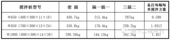 T——每幅桩水泥用量;S——单幅桩截面积;d——桩长度;r——天然土平均重度;首幅桩水泥用量15.74t膨润土用量1.57t;单幅桩水泥用量10.50t膨润土用量1.05t。