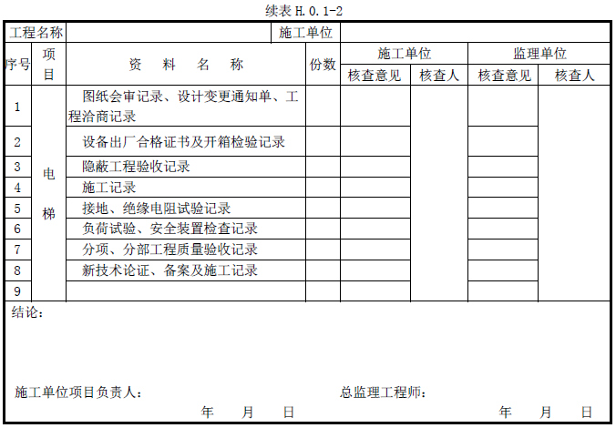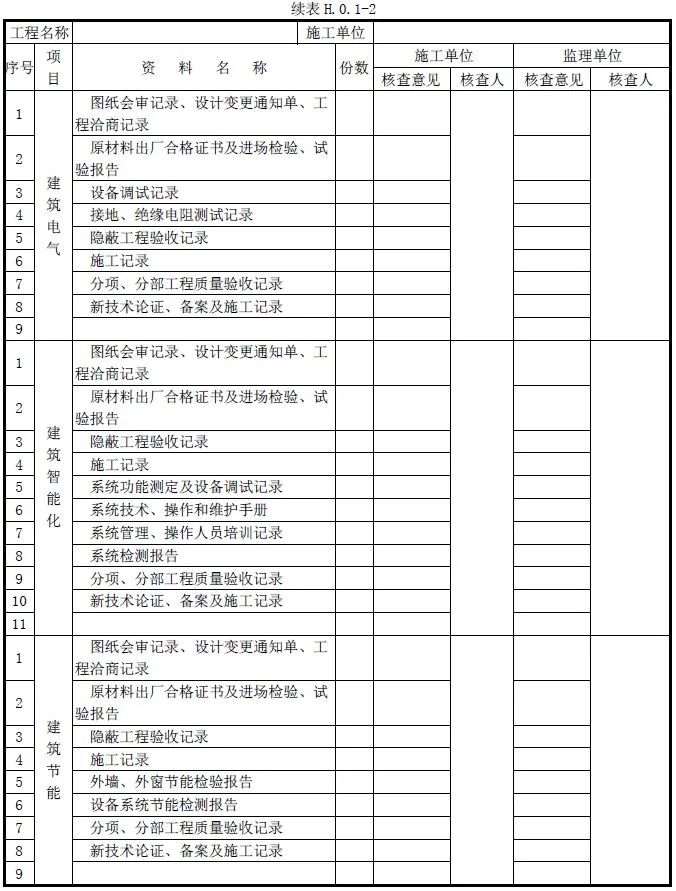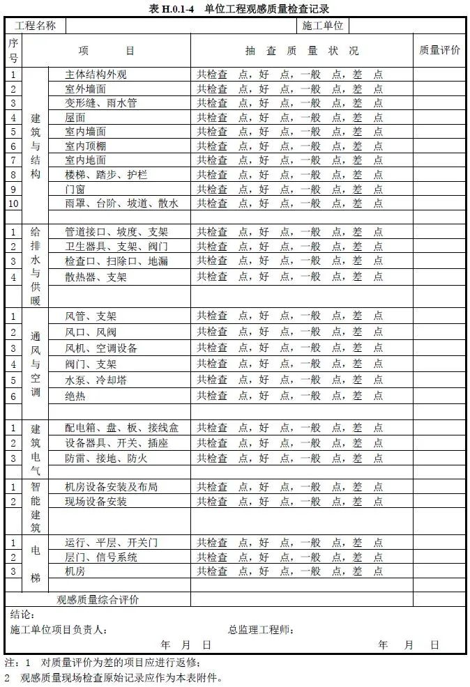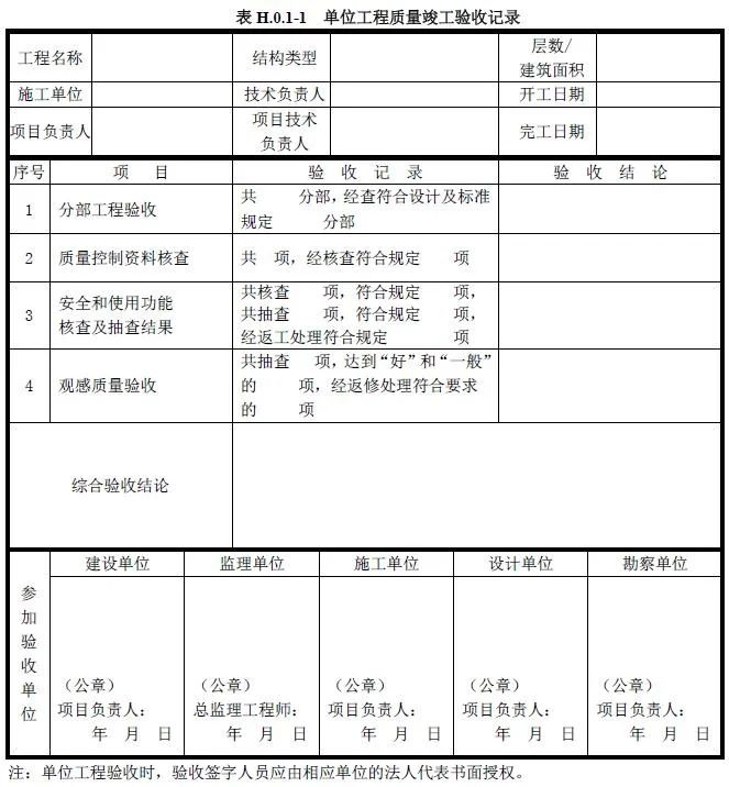 单位工程质量竣工验收记录、质量控制资料核查记录、安全和功能检验资料核查及主要功能抽查记录、观感质量检查记录应按《建筑工程施工质量验收统一标准》附录H填写。