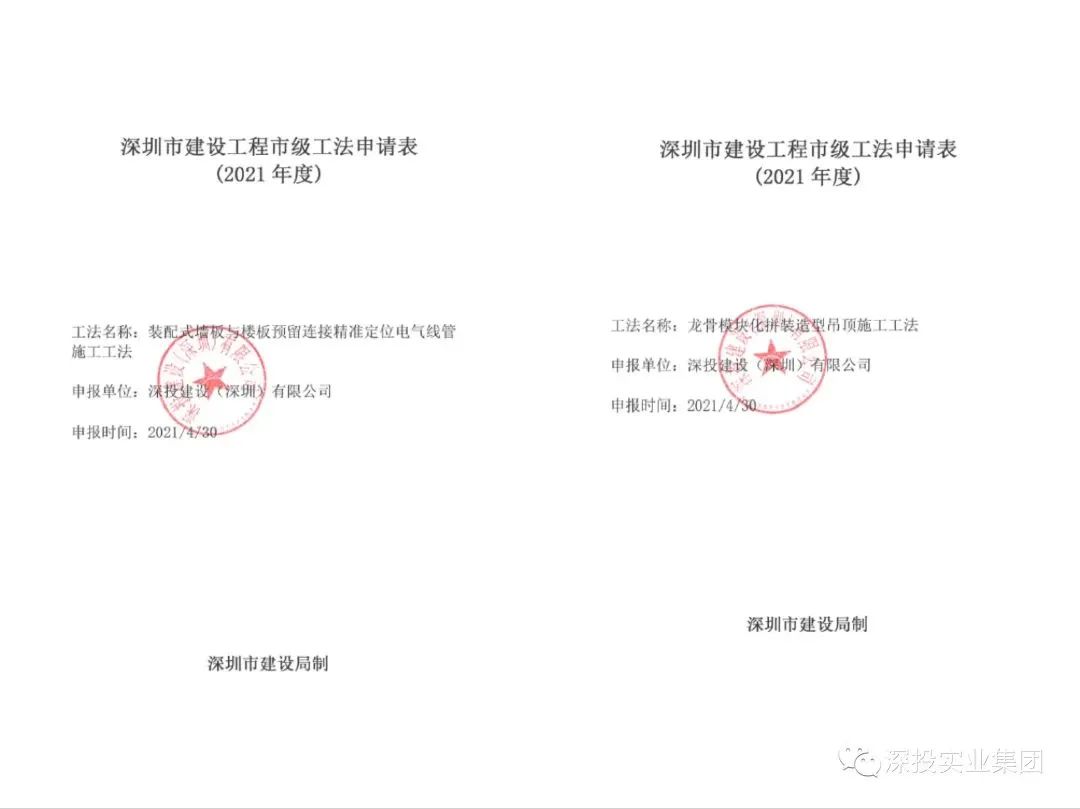 ● 积极申报推广应用工法,2021年在申请的省市两级工法共有9个,其中有龙骨模块化拼装造型吊顶施工工法等绿色施工工法5个。