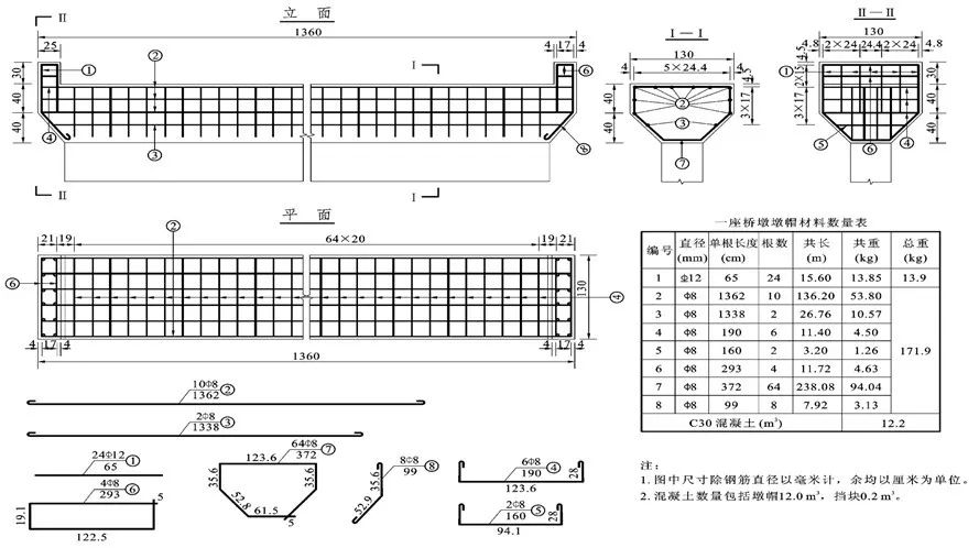(2)桥墩墩帽及挡块钢筋结构图识读 图11-26为该桥桥墩墩帽的钢筋结构图,包括立面图、平面图、钢筋成型图、钢筋数量表等内容。