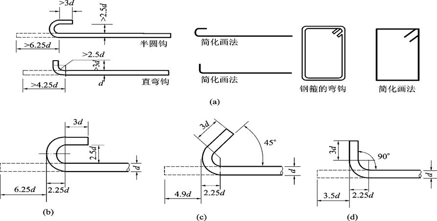 (a)钢筋弯钩的画法;(b)半圆形弯钩;(c)斜弯钩;(d)直角形弯钩