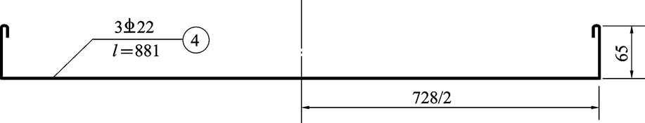 又如图11-21所示,4号22钢筋长度为728+65×2,查表11-3得弯钩增长长度为138 mm,90°弯转长度为24 mm,728+65×2+2×(13.8-2.4)=880.8≈881 mm。
