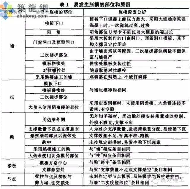 1 模板胀模问题引起的混凝土质量缺陷现象、发生的部位及原因: