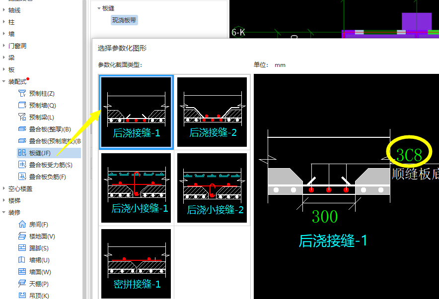 1)新建板缝,选择适合您项目的板缝参数图。本案例中使用后浇接缝-1的形式,缝宽定为300。顺缝板底纵筋根数为3根,级别及直径同当前预制板同向底筋,按水平构件平面布置图中板缝的位置绘制板缝。