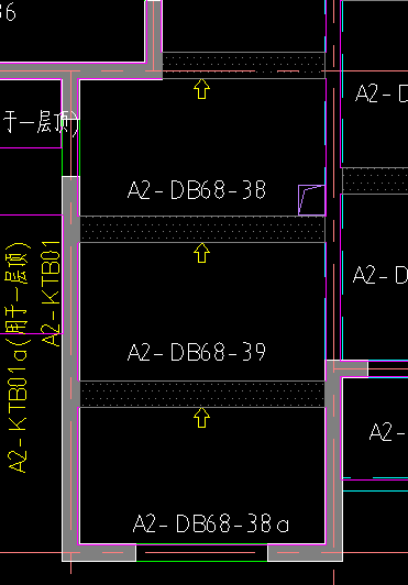 预制板间的板缝为现浇,板缝钢筋为现场绑扎。上图二中板缝宽≥200(具体宽度看“水平向预制构件平面布置图”),无板缝钢筋(板缝处粉色钢筋为预制板出筋)。而图三中板缝钢筋为箭头所指的三根钢筋,配筋同同向预制板筋。