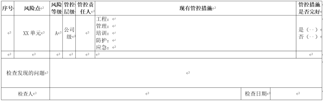 结合前文所述风险与隐患的关系,企业应对各风险点的现有管控措施通过隐患排查等形式进行管控。最理想的做法是在对风险分级管控的基础上,明确风险点及管控措施,列出详细的隐患排查清单,对风险点的各类管控措施进行隐患排查,确保管控措施有效。