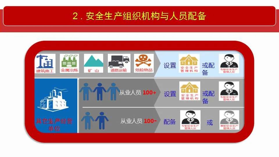 企业应依法依规设置安全生产管理机构或者配备专(兼)职安全生产管理人员,企业主要负责人、分管安全生产负责人、安全总监、安全生产管理人员,应具备与本单位所从事的生产经营活动相适应的安全生产知识和管理能力。其中,高危行业企业应设置安全生产管理机构、配备专职安全生产管理人员,危险化学品、矿山、道路运输、建筑施工等重点行业领域内达到一定规模的生产经营单位应配备安全总监、注册安全工程师。