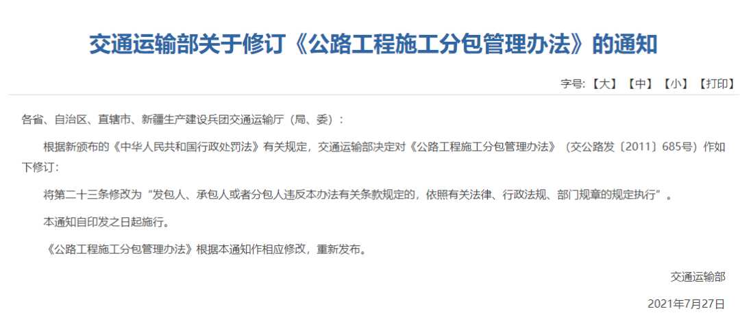 交通运输部关于修订《公路工程施工分包管理办法》的通知