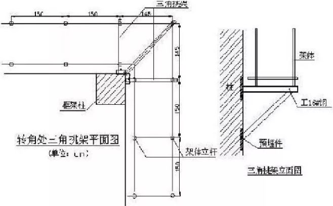 如果结构角部钢筋较多不能留洞,可采用设置预埋件焊接型钢三脚架等措施。