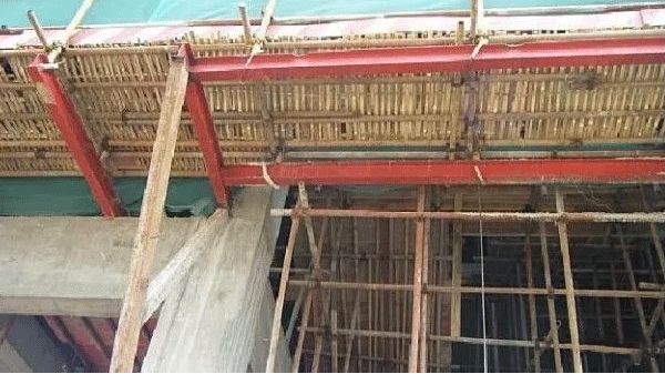 挑钢梁支承点应设置在结构梁上,不得设置在外伸阳台上或悬挑板上,故该处利用垫木垫起。如果必须设置阳台时,要求该处的支撑体系不得拆除,并进行承载力计算。