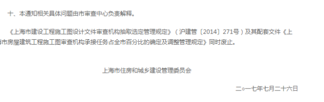 7月28日,上海市住房和城乡建设管理委员会在其官网发布《关于取消本市房屋建筑工程施工图审查 抽取选定制度的通知》。
