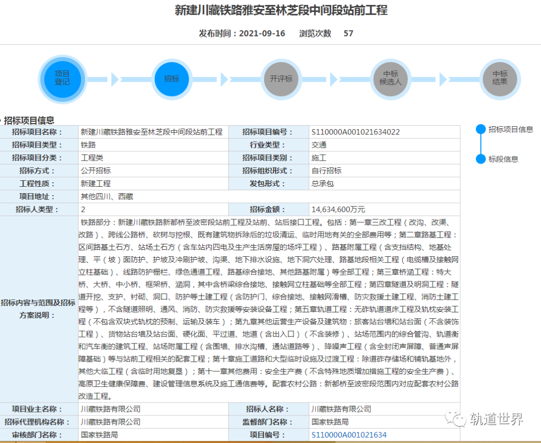 本建设项目新建川藏铁路雅安至林芝段已由国家发改委以《关于新建川藏铁路雅安至林芝段的可行性研究报告的批复》(发改基础〔2020〕1437号)批准建设,项目业主为川藏铁路有限公司,建设资金来自国家出资,项目出资比例为项目出资比例为100%,资金已落实,施工图设计文件完备,招标人为川藏铁路有限公司。本次招标项目已具备法定招标条件,现进行公开招标,特邀请有兴趣的潜在投标人(以下简称申请人)提出资格预审申请。