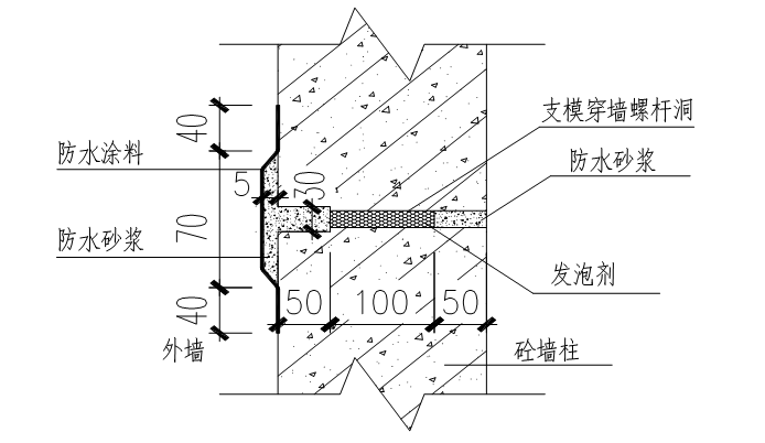 螺杆眼拓孔/pvc套管清除→螺杆洞内吹孔清扫→孔内注、喷水湿润→外墙螺栓孔外侧(或内墙一侧)防水砂浆封堵→螺栓孔中部发泡→螺栓孔外墙内侧(或内墙另一侧)封堵。
