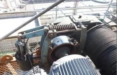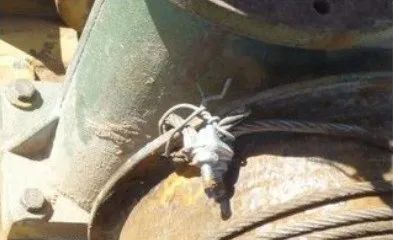 安装工在更换钢丝绳后压板丢失,为了让设备尽早能用就用一个绳卡来做钢丝绳的压板。