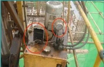 (2)液压油泄漏如果此时单向溢流阀工作的话,套架将停在半空中上不能上下不能下,(此时的处理方法:利用人工调节单向溢流阀慢慢将油缸里的液压油放出使套架下降之安全位置)如果液压油泄漏的同时单向溢流阀不工作的话(不工作的情况不多),套架迅速自行下落发生塔吊倾覆事故。