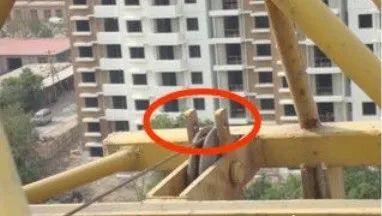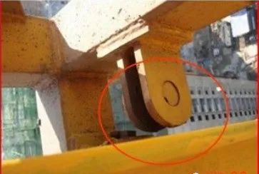 没有高度限位进行控制如下图所示吊钩直接冲到顶部易发生钢丝断裂,如果吊着重物一旦钢丝绳断裂会发生塔吊倾覆事故。