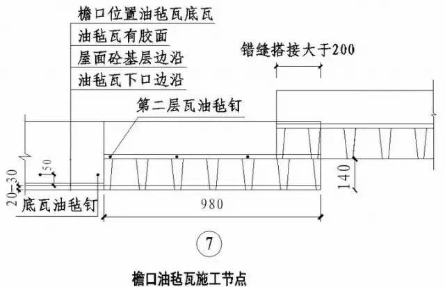10)油毡瓦与油毡瓦水平错缝搭盖时,错缝搭接水平长度不小于200mm(见图7)。