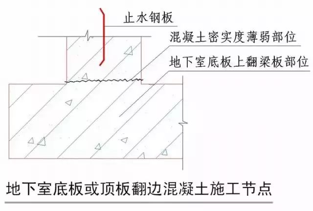 由于商品混凝土坍落度大,在进行地下室底板或顶板翻边部位施工时,振动棒振捣使混凝土流座到底板,施工人员往往少振或不振捣,导致混凝土不密实,因此形成渗漏薄弱点。