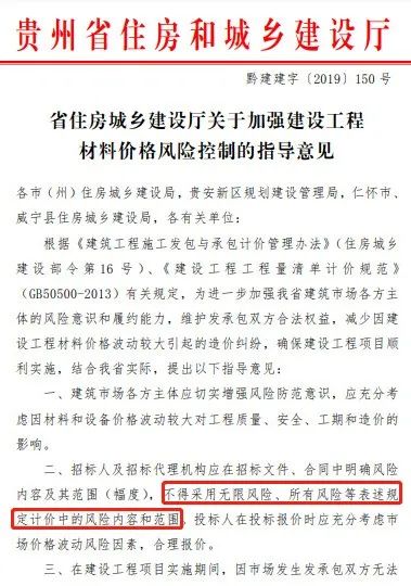 2019年4月15日,贵州省住建厅发布《关于加强建设工程材料价格风险控制的指导意见》,明确:
