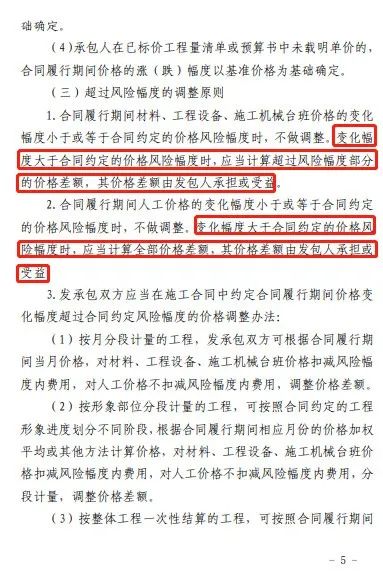 2、主要材料价格约定的风险幅度宜控制在±5%以内,风险幅度以内的由承包人承担或受益,风险幅度以外的由发包人承担或受益。
