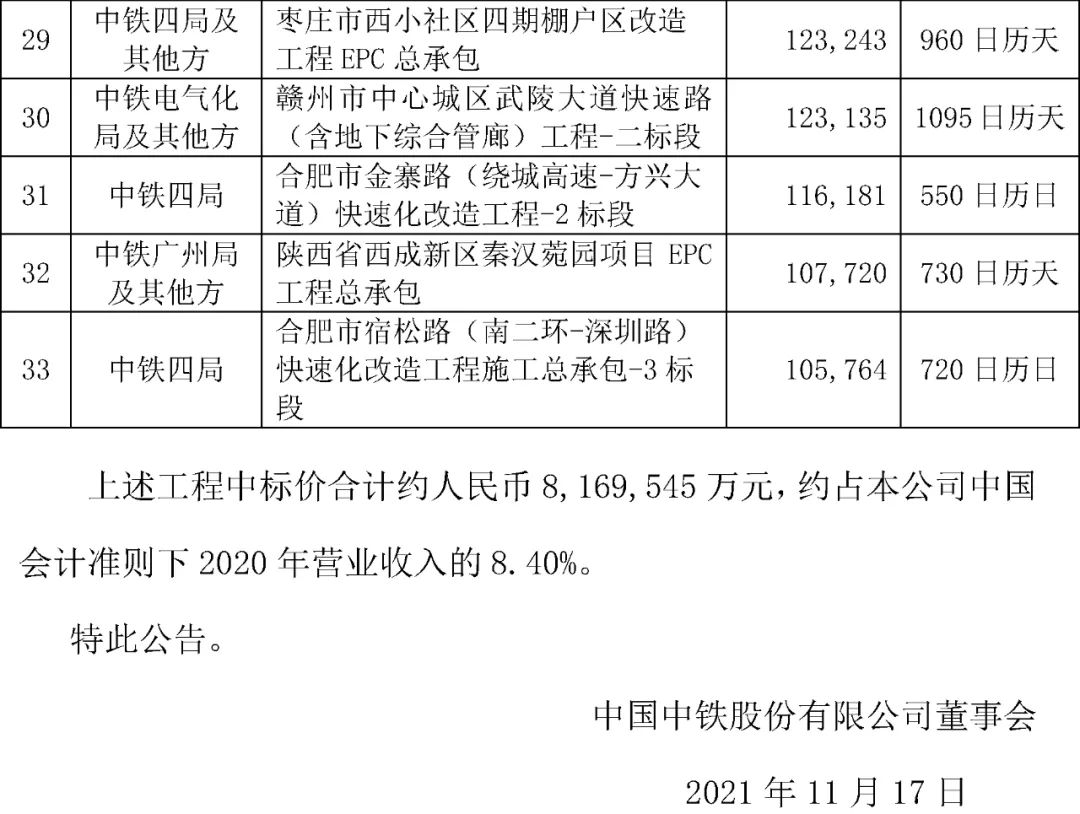 11月16日,中国中铁公告,近期公司中标重大工程33个,中标价合计816.95亿元,约占本公司中国会计准则下2020年营业收入的8.40%。