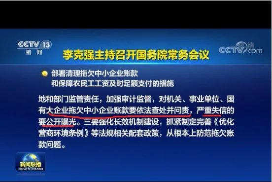 会议指出,治理拖欠中小企业账款,直接涉及推进市场化、法治化、国际化营商环境建设。今年以来,受国内外复杂严峻环境和疫情多点散发等因素影响,中小企业应收账款增长较快、被拖欠情况增多。要贯彻党中央、国务院部署,按照保市场主体的要求,依法依规加大对拖欠中小企业账款的整治力度。一要严格执行《保障中小企业款项支付条例》,整治滥用市场优势地位恶意拖欠账款行为。机关、事业单位从中小企业采购货物、工程、服务,应当自货物、工程、服务交付之日起30日内支付款项,最长不得超过60日。机关、事业单位和大企业不得强制中小企业接受商业汇票等非现金支付方式,不得滥用商业汇票变相占用中小企业资金。大企业应在年度报告中向社会公布逾期未支付的中小企业款项。二要压实地方属地和部门监管责任,加强审计监督,对机关、事业单位、国有大企业拖欠中小企业账款要依法查处并严肃问责,严重失信的要公开曝光。三要强化长效机制建设,健全建设工程价款结算相关制度,提高工程进度款支付比例。全面推行保函(保险)替代保证金。会议强调,要抓紧制定完善《优化营商环境条例》等法规的相关配套政策,从根本上减少和防范拖欠账款问题。
