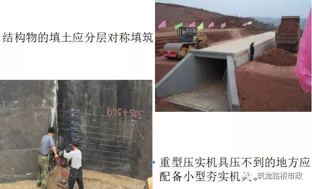 结构物的填土应分层对称填筑,采用重型碾压机具进行作业时,每层最大压实厚度不大于15cm,重型压实机具压不到的地方应配备小型夯实机具,每层最大厚度不得大于10cm。