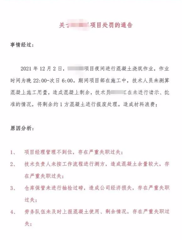 某公司施工员晚上加班打混凝土打到十一点半,因为施工结束多剩下一方混凝土没有合理处置,直接让商砼站拉回去。被人举报到公司后,公司非常严肃得对待此事件,直接发红头文件。