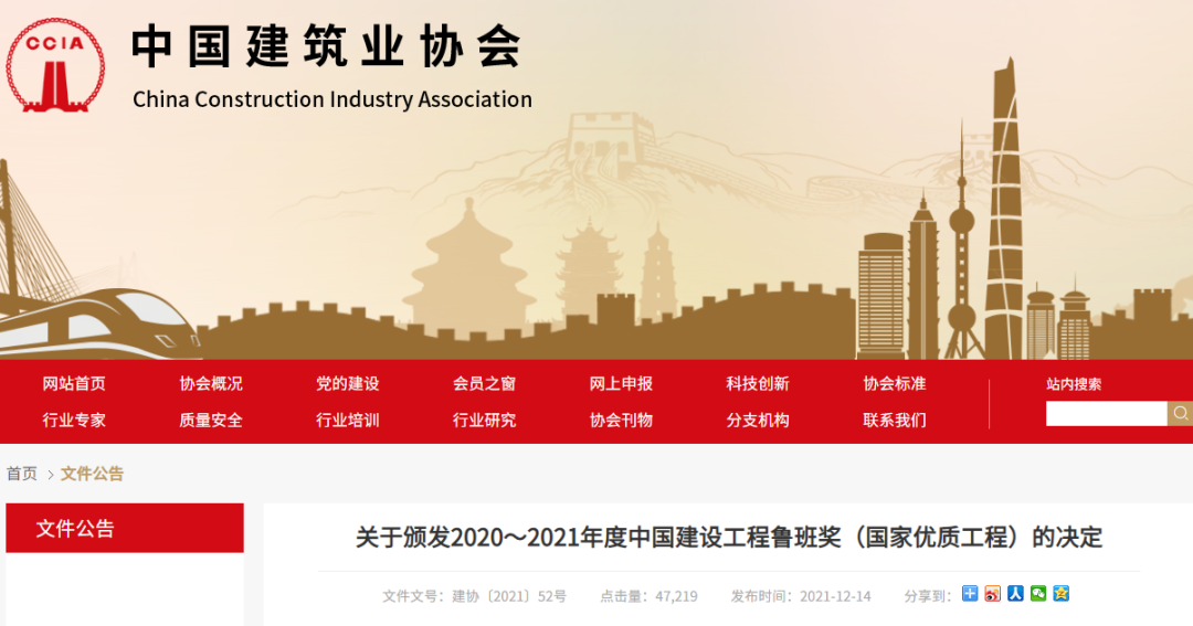 12月14日,中国建筑业协会发布《关于颁发2020~2021年度中国建设工程鲁班奖(国家优质工程)的决定》。