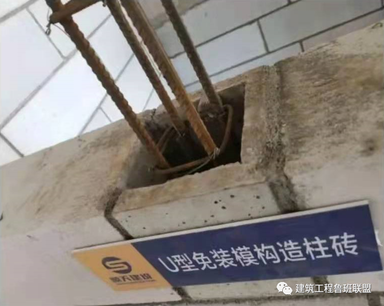 预制成品U型构造柱砖、水平系梁砖,在砌筑过程中,构造柱钢筋绑扎完成后,U型砖开口朝两侧放置,随砌体同时砌筑施工,完成至一定高度后即可浇筑构造柱混凝土;水平系梁U型砖开口朝上随砌体一同砌筑,完成后放入水平系梁钢筋浇筑混凝土,免去支模环节。