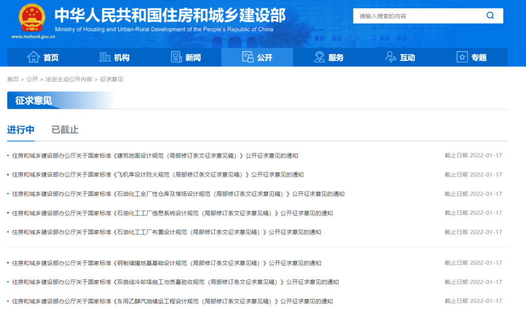 12月22日,住建部发布8项国家标准的征求意见稿,意见征求截止日期为2022年1月17日。具体如下: