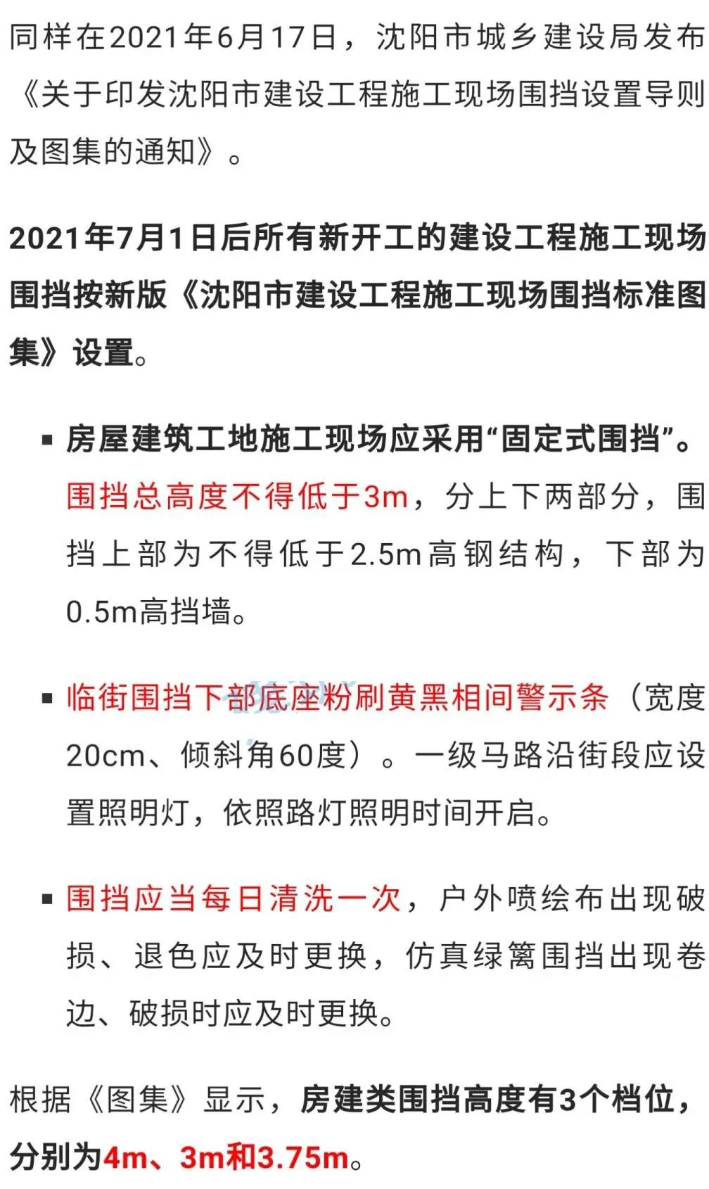 沈阳要求所以房建类围挡不得低于3米,按照图集的3个档位来设置,分别为4m、3m和3.75m,2021年7月1日起执行。