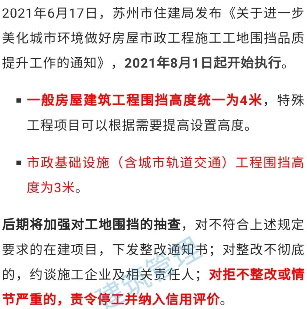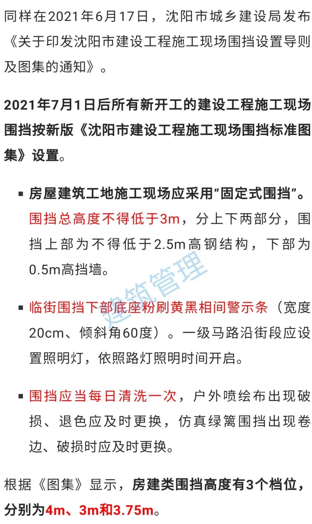 近期,多地发布施工现场围挡设置的文件,大多数地区要求房建类围挡高度不低于2.5米。为提升整体形象,遏制扬尘影响,部分地区提出了更高的要求: 沈阳要求所以房建类围挡不得低于3米,按照图集的3个档位来设置,分别为4m、3m和3.75m,2021年7月1日起执行。 苏州要求房建工程围挡高度统一设置4米,2021年8月1日起执行。 烟台要求房屋建筑施工工地主干道两侧围挡高度不低于4米。 襄阳要求围挡建设不完成,一律不得施工;围挡维护保养,不及时、不到位,一律停止施工。 近期,浙江省诸暨市住建局发布《关于进一步提升建筑工地围挡设置标准的通知》。明确:城区建成区范围内房建项目建筑工地的围挡高度不低于5米。据小编所知,应该属于最高标准了。 自发文之日起30天后正式开始施行,自施行之日起五年内有效。 城区建成区范围内房建项目建筑工地的围挡高度不低于5米。市区其他区域房建项目工地围挡高度不低于3米。其他乡镇建筑工地围挡高度不低于2米。 市政工程工地可采用高度不低于2米的定型式移动围挡或者砖砌矮围挡打围。 距离交通路口3米范围内设置施工围挡的,围挡1米以上部分应当采用通透性围挡,且不得影响交通路口行车视距。 房屋建筑工程工地围挡应设置仿真绿植,采用人造草坪作为饰面的仿真绿植围挡结构,人造草坪背胶应与围挡墙体贴紧粘牢,无明显色差,不褪色,高度(厚度)不低于1厘米,草皮簇绒密度不低于13650针/平方米,草纤维纤度不低于7500分特。 全市纳入建设局监管的房屋建筑工程、市政基础设施工程应沿四周设置连续封闭的围挡。 禁止无围挡施工,施工单位应安排专人或专业队伍定期对围挡进行清洁、修复或更换。 对工地围挡开展的抽查检查,对检查发现的问题及时落实整改。 整改不到位、不彻底的,我局将约谈施工企业及相关责任人;拒不整改或情节严重的,责令停工并纳入信用评价。 相关链接:8月1日起,房建工程围挡高度统一设置为4米!抽查拒不整改的,停工! 2021年12月27日,襄阳市住建局发布《关于印发<襄阳市中心城区施工工地围挡管理暂行办法>的通知》自颁布之日起执行,有效期2年,明确: 1、房屋建筑、房屋拆除工程和老旧小区改造工程: 应沿工地四周连继、全封闭设置钢结构围挡。 围挡骨架宜为轻钢结构框架。 把围挡建设成图文并茂、生动活泼、美观大方、底色一致的“一街一景、一墙一品”效果,彰显文明襄阳特色的文化墙。 围挡面层用绿色仿真草皮全覆盖。 1、鼓励建设钢筋混凝土装配式围挡,围挡底部设置砖砌300mm高挡土墙,全密闭。 2、围挡面层用绿色仿真草皮全覆盖,仿真草皮覆盖应平整,底部与地面无空隙。 3、鼓励房屋工地将施工临时围挡建设成为永久性通透围挡,实现“临久结合”。 4、鼓励房屋建筑工地探索建设密植高2500mm、厚度大于600mm的“绿化植物围挡”。 1、围挡建设不完成,一律不得施工;围挡维护保养,不及时、不到位,一律停止施工。 2、建设单位是落实围挡建设的首要责任人。 建设单位应将围挡建设费用列入工程预算,及时向施工总承包单位拨付到位。 开工前,建设单位应督促施工单位或委托监理单位督促施工总承包单位将围挡按本《暂行办法》设置到位;不到位的,一律不得施工。 3、在监理单位未到位开工建设的工地,建设单位应承担监理的全部责任。 4、在施工总承包单位未到位开工建设的工地,建设单位应承担围挡建设的全部责任。 相关链接:建设单位负首责!围挡建设不完成,一律不得施工!保养不到位,停止施工! 问题来了 你觉得工地围挡应该设置多高呢? 欢迎留言区讨论 各建设、施工、监理企业(单位): 为进一步提高我市建筑工地围挡设计策划能力,提升建筑工地围挡维护管理水平,促进城市形象提升,助力打造“全国文明典范城市”,现就进一步提升建筑工地围挡设置标准的有关要求通知如下: 一、标准提升范围和责任主体职责 1.全市纳入诸暨市住房和城乡建设局监管的房屋建筑工程、市政基础设施工程应沿四周设置连续封闭的围挡。 2.建设单位负责组织实施围挡标准提升建设工作,统筹建设费用将围挡建设纳入成本,并组织对围挡进行验收。施工总承包单位负责按照围挡专项设计方案具体实施。监理单位负责监督施工总承包单位按专项设计方案建造围挡。 3.围挡设置时应充分考虑不同施工阶段要求,建筑工地开工前应落实封闭围挡,至相关附属工程(市政设施、绿化工程)全部施工完成后方可拆除施工围挡,禁止无围挡施工。施工单位应安排专人或专业队伍定期对围挡进行清洁、修复或更换,确保围挡整洁美观。 二、围挡提升标准 1.建筑工地围挡结构必须根据场地条件、使用要求、结构选型等情况进行设计,并满足地基承载力、基础、结构抗风等验算要求,充分保障安全性,确保极端大风天气安全可靠。钢结构设施的设计、施工、安装、维护保养、安全检测及材料、施工质量验收等应符合《城市户外广告设施技术规范》(CJJ149)、《户外广告设施钢结构技术规程》(CECS148:2003)等相关规定。 2.城区建成区范围内房建项目建筑工地的围挡高度不低于5米(具体范围按文明城市创建办要求确定),市区其他区域房建项目工地围挡高度不低于3米(城东、城南至三环线沿线两侧,城西城北至二环线沿线两侧),其他乡镇建筑工地围挡高度不低于2米。市政工程工地可采用高度不低