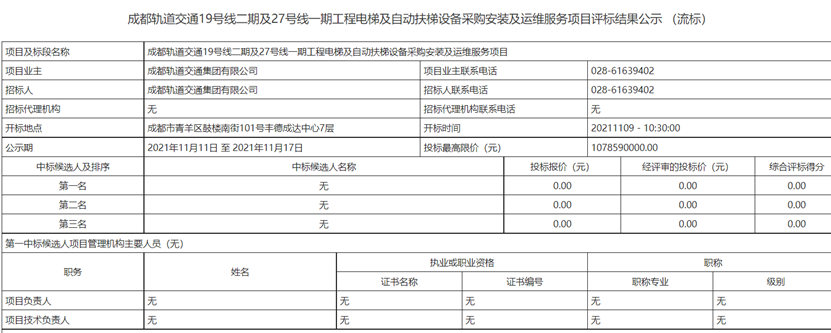 近日,《成都轨道交通8号线二期、13号线一期、10号线三期、17号线二期、18号线三期、30号线一期及轨道交通资阳线工程电梯及自动扶梯设备采购安装及运维服务项目评标结果公示(流标)》发布,根据公告,无中标候选人,8家投标单位全部废标,废标理由各有不同。