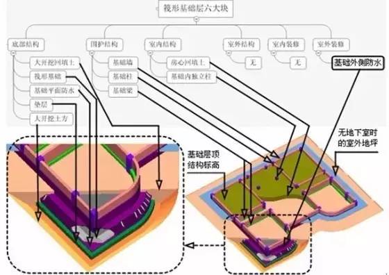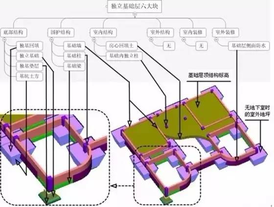 基础层仍然按照六大块的原理进行分解,只是把顶部结构换成了底部结构,根据基础类型不同分为筏形基础、条形基础、独立基础、桩承台基础。