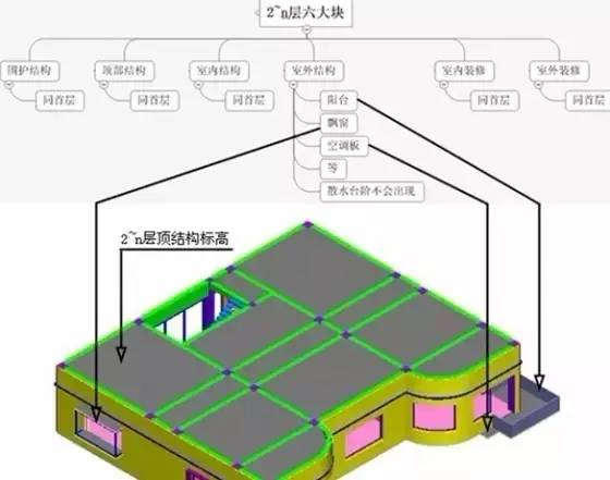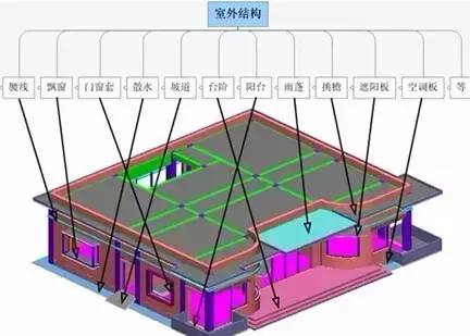 2~n层一般属于建筑物的标准层,其中围护结构、顶部结构、室内结构、室内装修、室外装修所包含的构件同首层,室外结构中出现频率最高的是阳台、飘窗、空调板,散水、台阶一般不会出现,见图20: