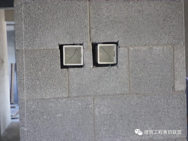 1)深化结构与机电图纸,进行BM连锁砌块与穿线管道、开关、电箱等相对位置的排布,在砖砌筑之前先按深化图打孔或切割,避免后期剃凿破坏墙体;2)由下至上的线管,砌筑时将砌块套入;由上至下的线管,砌筑时将砌块侧面开槽,将管线套入砌块中。