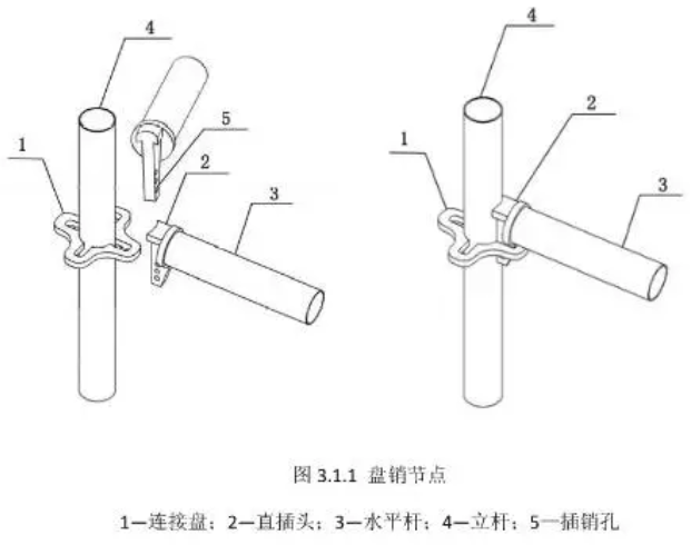 盘扣式脚手架立杆采用套管承插连接,水平杆和斜杆采用杆端扣接头卡入连接盘,用楔形插销连接,形成结构几何不变体系的钢管支架。