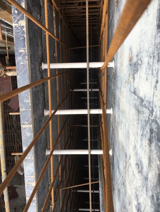 PVC套管长度等于墙厚,两端各设置一个喇叭口,每根对拉螺栓部位设置一个套管,并将对拉螺栓从套管中穿过,代替水泥衬棍。