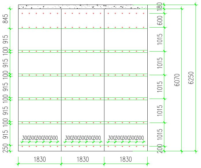 墙体模板高度(从下而上):250mm、915mm、100mm、915mm、100mm、915mm、100mm、915mm、100mm、915mm、845mm。
