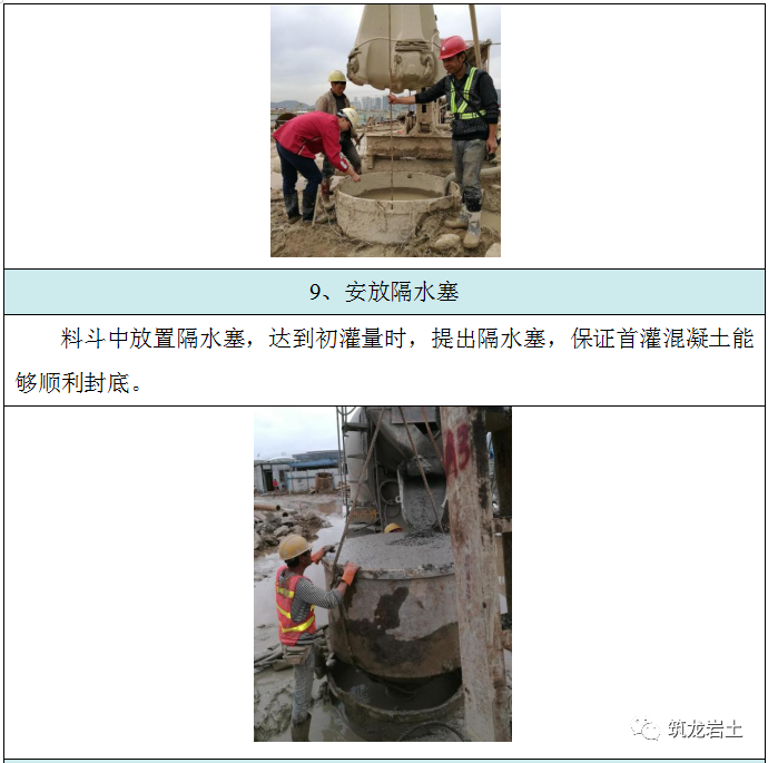 为确定钢筋笼顶标高,并保证钢筋笼的垂直放置,预先焊接两根等长度对称布置的吊筋,吊筋一般伸出孔口,作为判断钢筋笼上浮或下沉的依据。1)应先收紧内套钢丝绳将锥提起,检查锥的中心位置是否与护筒中心一致,检查锥架、底腿是否牢固,检查卷扬机和自动挂脱之间动作是否灵活、可靠。2)应根据冲岩土的松散度选择合适的冲程:冲松散层宜选小冲程(0.5-1.0m);冲砂卵石宜选中等冲程(1-2m);当砂卵石较密实时可加大冲程(2-3m);在基岩中冲击钻进时,宜采用高冲程(2.5-3.5m)。3)冲孔时应及时将孔内残渣排出,每冲击 1~2m,应排渣一次,同时检查成孔的垂直度,如发生斜孔、塌孔或护筒周围冒浆时,应停机,待采取相应措施后再进行施工,相邻桩机不宜过近,以免互相干扰,在刚灌注完毕混凝土的桩旁进行另一根桩成孔施工时,其安全距离应大于 4D(D 为桩直径),或最少时间间隔不应少 36 小时,以防止坍孔。每次捞渣后,应及时向孔内补充泥浆或黏土, 保持孔内水位高于地下水位 1.5-2.0m。应根据不同的钻孔方法、施工设备、设计要求及地层条件,来合理选用清孔方法。a.抽浆法清孔:抽浆法清孔较彻底,且清孔速度快,可适用于各类土层、各种钻孔方法的摩擦桩或支承桩,但在孔壁易坍塌的桩孔中应谨慎使用,以防坍孔。b.换浆法清孔:对以粘性土及细颗粒砂性土层为主的桩孔可采用换浆法清孔。采用该法清孔不易引起坍孔,但清孔速度慢,须控制好泥浆指标及清孔时间, 否则清孔效果难以保证。c.掏渣法清孔:对于冲击、冲抓、旋挖钻进的桩孔,应先采用掏渣法进行初步清孔,待较大颗粒沉渣清理完毕后,可换用换浆法进一步清孔,同时降低孔内泥浆密度。d.喷射法清孔:在导管等混凝土灌注设备已安装,实测孔底沉渣厚度超出规定或设计要求,但超出范围不大,进行二次清孔费时费力,且影响孔壁稳定的情况下,可采用喷射清孔法进行处理,并立即灌注水下混凝土。该法仅宜作为其他方法清孔的辅助手段。清孔持续时间应根据具体清孔方式、地质情况及孔底排出的泥浆指标确定, 抽浆法清孔的速度较快(一般不少于 10min 即可),换浆法清孔速度较慢(30min 至数小时不等),无论采用何种清孔方式,均应确保清孔持续时间,否则难以达到清孔效果。a.清孔过程泥浆指标清孔过程中泥浆密度一般应比钻孔泥浆密度小,但泥浆密度及粘度过小,影响孔壁稳定;采用正循环清孔时,泥浆密度及粘度过小,还会影响泥浆悬浮钻渣的能力,降低清孔效果。在粘性土、粉土及粉砂土为主的土层中,清孔过程中输入泥浆指标宜控制为:相对密度 1.05~1.10;粘度 16~20Pa·s;含砂率<4%。b.终止清孔泥浆指标终止清孔前应在孔底取泥浆进行性能指标检测,终止清孔泥浆指标一般控制在以下范围:相对密度 1.03~1.15;粘度 17~20Pa·s;含砂率<4%;胶体率>98%。4)缩短施工历时在确保清孔效果的同时,应加强工序衔接,提高工作效率,尽量缩短清孔至混凝土灌注之间的的时间间隔。5)进行首批混凝土灌注前,再次探测泥浆指标及孔底沉渣层厚度,如超过规定要求时,立即进行再次清孔,直至符合要求时方可灌注水下混凝土。根据建筑工程《地基基础工程施工质量验收规范》(GB 50202-2018),混凝土灌注桩的质量检验标准应符合表中的规定。