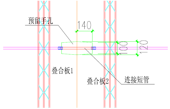 按照叠合板图纸设计,在叠合板桁架筋内配电线管连接线盒及手孔,进手孔处预留直接头进接头进手孔的深度约1公分。