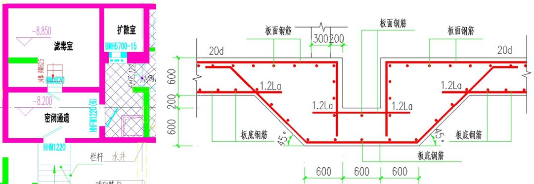 1)人防区内梁板配筋图纸一般由人防院设计,但模板关系(如洞口定位,梁定位、标高)由民用院模板图表达,所以梁板配筋应结合两院图纸施工。