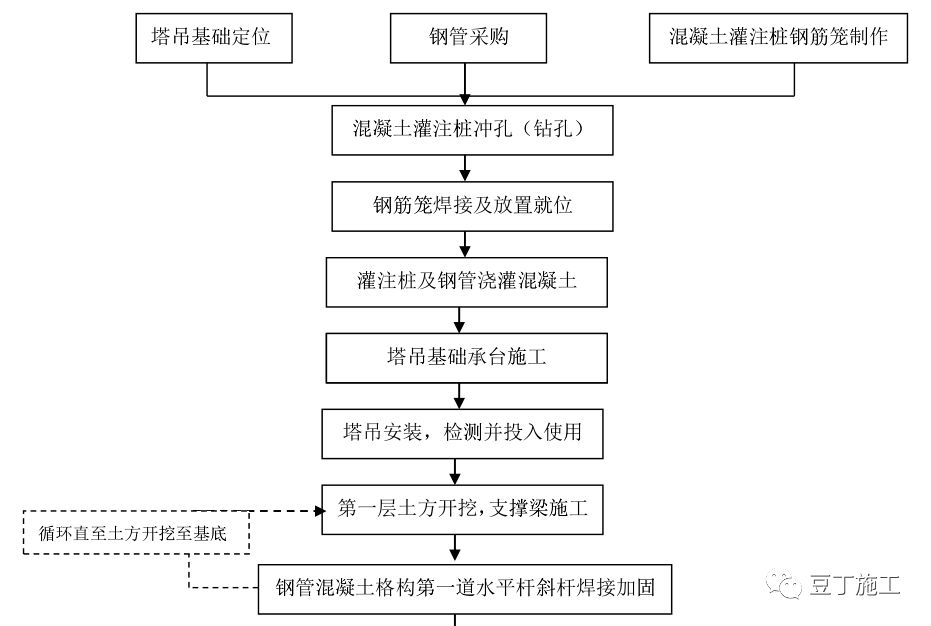 1)在土方开挖之前首先开挖塔吊基础承台土方,按设计标高及设计尺寸进行土方清底(塔吊基础灌注桩桩身混凝土强度应达到设计强度的 80%)。