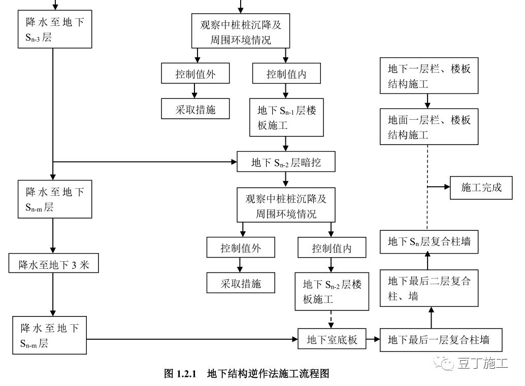 在施工基础底板前,全部的结构和施工荷载主要依靠中柱桩和地下连续墙承担。但是,随着上部结构施工层数的增加,对中柱桩和地下连续墙的荷载也增加,而中柱桩和地下连续墙的承载能力在减少,势必导致相邻中柱桩之间的差异沉降,这种差异又反过来改变上部结构和地下室的内力分布,引起附加应力。因此,逆作法施工中,在地下室基础底板完成前,地下连续墙和中柱桩直接受力,未直接受力的工程桩之间的相互影响依然存在,如果各根中柱桩之间或地下连续墙之间有较大的差异沉降,己浇筑的楼板与梁系就会产生裂缝,将危及上部结构的安全。所以,逆作法设计和施工中,必须计算中柱桩间和边桩与地下连续墙间的沉降,以及如何通过实测控制他们的差异沉降。