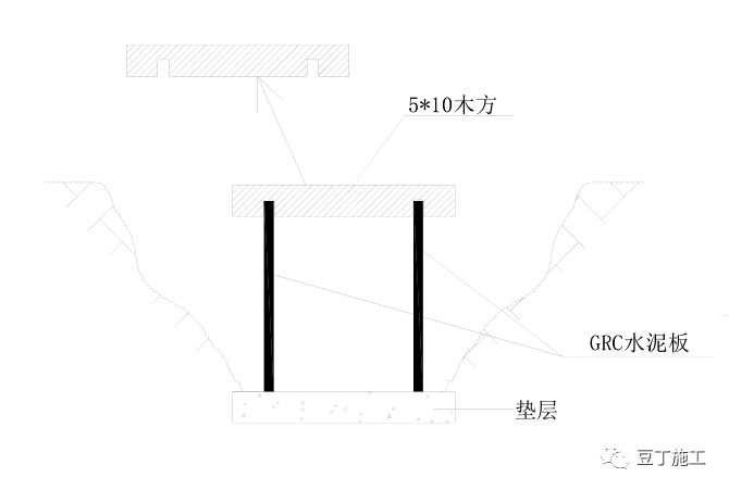 水泥板运输到工地采用塔吊吊装到基坑内,选择较平整部位放置,根据尺寸大小可以人工抬置施工部位进行安装,在开挖好的梁及承台体侧面嵌入大头木楔并拉线找直,把 GRC 水泥模板贴紧,梁及承台侧面木楔用大钉子加固。如梁及承台自身截面尺寸过大、过高,可用木方进行内支撑或外加固;在梁及承台连接的地方,水泥板可以根据现场需要切割成符合要求的尺寸。水泥板衔接时要严丝合缝,可在侧面用木方连接加固在一起,测其垂直度要符合要求,见下图。